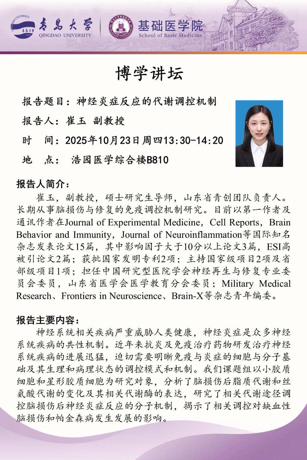 定期举办 “博学讲坛” 系列学术活动。该讲坛定位多元价值:不仅致力于全面提升研究生的科研素养与实践创新能力,也为院内教师打造了科研思路碰撞、学术经验共享的优质交流平台,同时诚挚欢迎外学院师生积极参与,助力不同领域研究者共同拓宽学术视野、凝聚科研共识。在第一期讲坛中,学院特别邀请到病理学与病理生理学专业青年导师崔玉副教授担任主讲人,带来高水平学术报告。新葡京娱乐场app