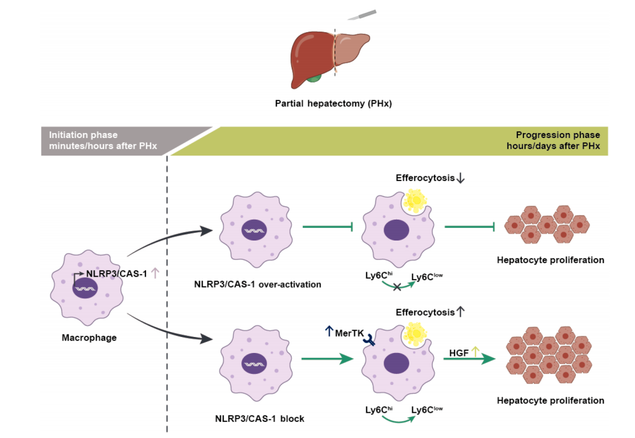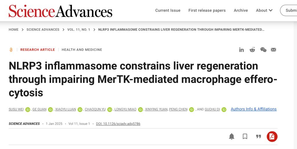 狄国虎、陈鹏教授课题组在Science子刊ScienceAdvances杂志在线发表了题为“NLRP3 Inflammasome Constrains Liver Regeneration Through Impairing MerTK Mediated Macrophage Efferocytosis”的研究论文(IF=11.7,DOI: 10.1126/sciadv.adq5786)。该研究揭示了巨噬细胞NLRP3炎症小体在调控肝脏再生中的重要作用,并为靶向NLRP3提供了新的治疗策略。2020级特种医学硕士研究生韦素素(现就职于齐鲁中科现代微生物技术研究院),青岛大学附属医院器官移植中心副主任医师关鸽,2021级特种医学硕士研究生栾晓瑜(现博士就读于中科院遗传与发育生物学研究所),2021级特种医学博士研究生于超群为共同第一作者。新葡京娱乐场app