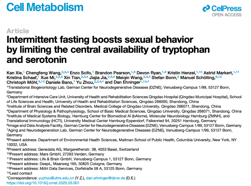 生理学专业2020级硕士研究生王成枫(本文第二作者,现由国家留学基金委资助在德国攻读博士学位),2017级硕士研究生弭雪(现在北京脑中心攻读博士学位)、2019级硕士研究生田欣和2022级在读硕士研究生贾佳佳在Cell Press细胞出版社旗下期刊Cell Metabolism(IF=27.7,中科院1区top)参与发表了一篇题为“Intermittent fasting boosts sexual behavior by limiting the central availability of tryptophan and serotonin”的文章,新葡京娱乐场app